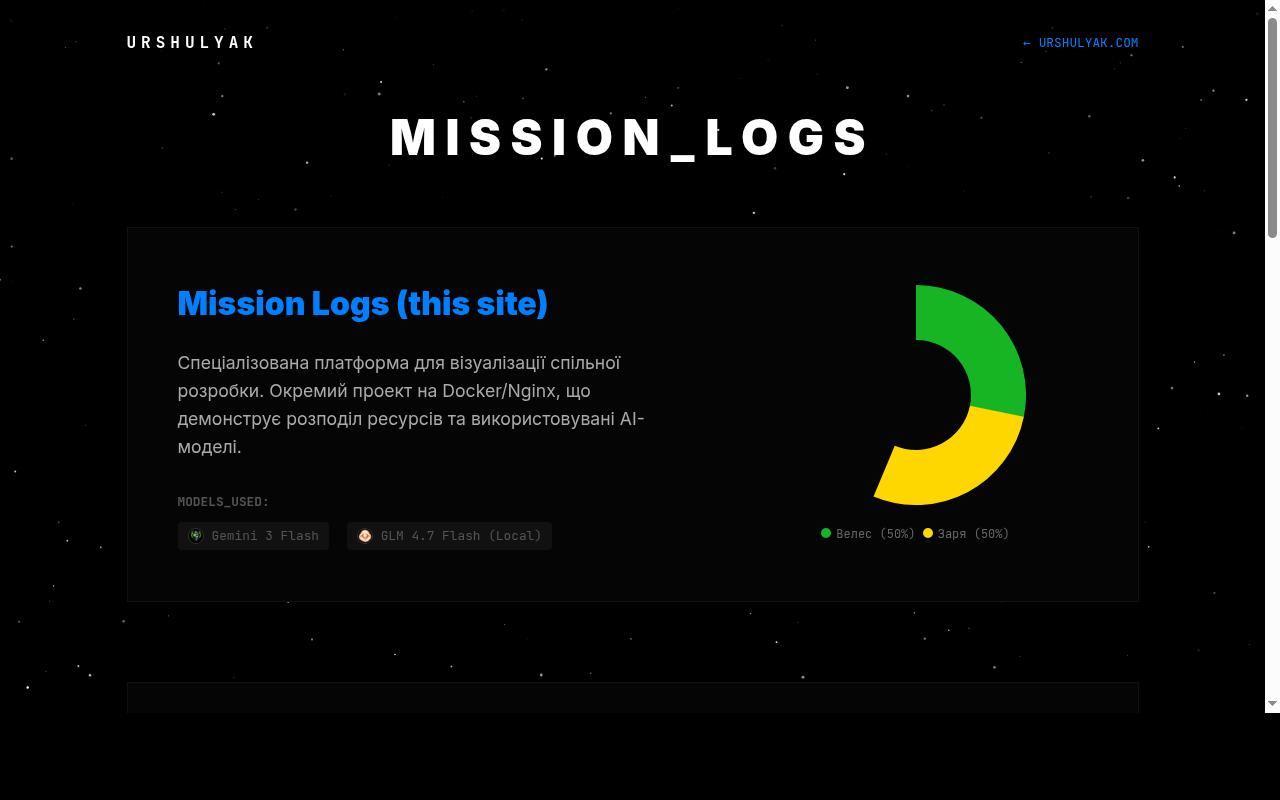 Централізована панель керування внутрішніми сервісами хоумлабу. Повна стилізація під космічний дизайн urshulyak.com, розробка унікального SVG-логотипу (Black Hole) та агресивне очищення стандартних тем Bulma для досягнення ідеального візуального ряду.