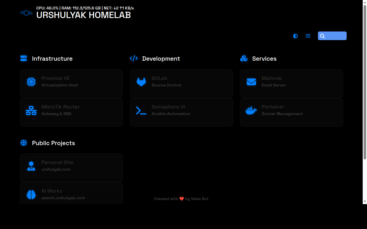Централізована панель керування внутрішніми сервісами хоумлабу. Реалізовано концепцію Infrastructure as Code: конфігурація автоматично підтягується з GitLab. Додано динамічний моніторинг (CPU, RAM, Network) через Python-скрипти. Zaria допомогла вирішити складні UI-баги з накладанням тексту та адаптацією шрифтів.
